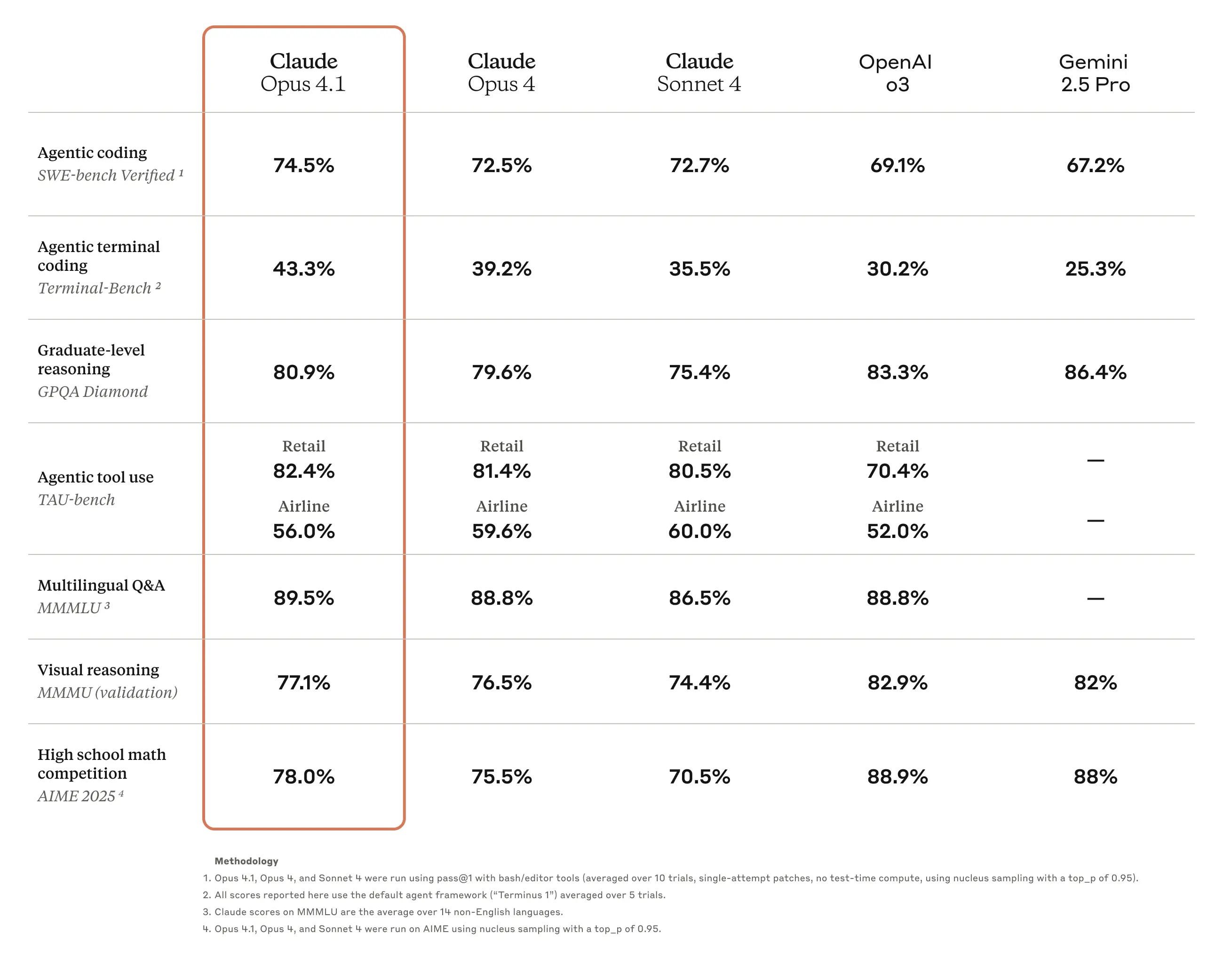 [From the system card]: Claude Opus 4.1 represents incremental improvements over Claude Opus 4, with enhancements in reasoning quality, instruction-following, and overall performance.