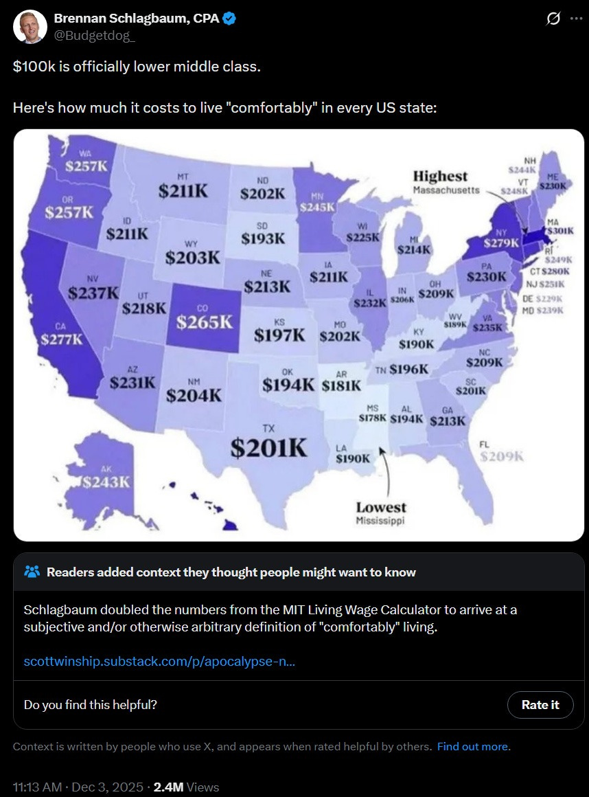 No, seriously, he took the MIT Living Wage Calculator and doubled it, and considers ‘comfortable’ to include 20% savings while meeting all ‘wants and needs.’ Must be nice.