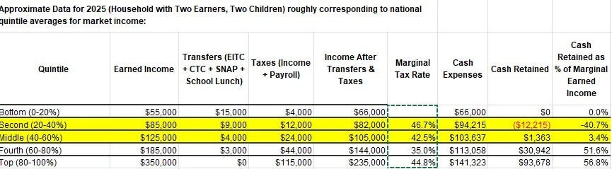 As an intuition pump to how tricky this is, redone from scratch for 2025, for families of exactly 4 only for now: We could change to instead provide a universal basic income (you can also call it a negative income tax) of $40k per family, plus a flat tax of about 25%-35% (depending on implementation details elsewhere) to $250k, then resume the current tax rates (so we don’t change how much we raise from the top of the distribution). No other default benefits, including Medicare and Medicaid, and no other federal taxes (no payroll, no Medicare tax and so on). My quick calculation says that’s roughly revenue neutral. Is that style of approach better? Maybe, but there’s at least one huge obvious problem, which is that this creates unsubsidized health insurance markets with no fallback, and so many others we’re not noticing. Of course, there’s huge upsides, especially if you fix the worst of the secondary effects.