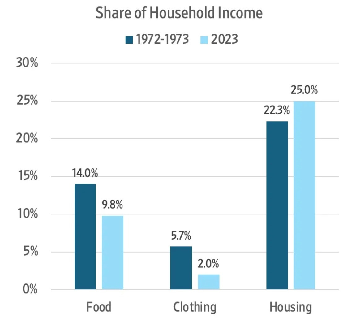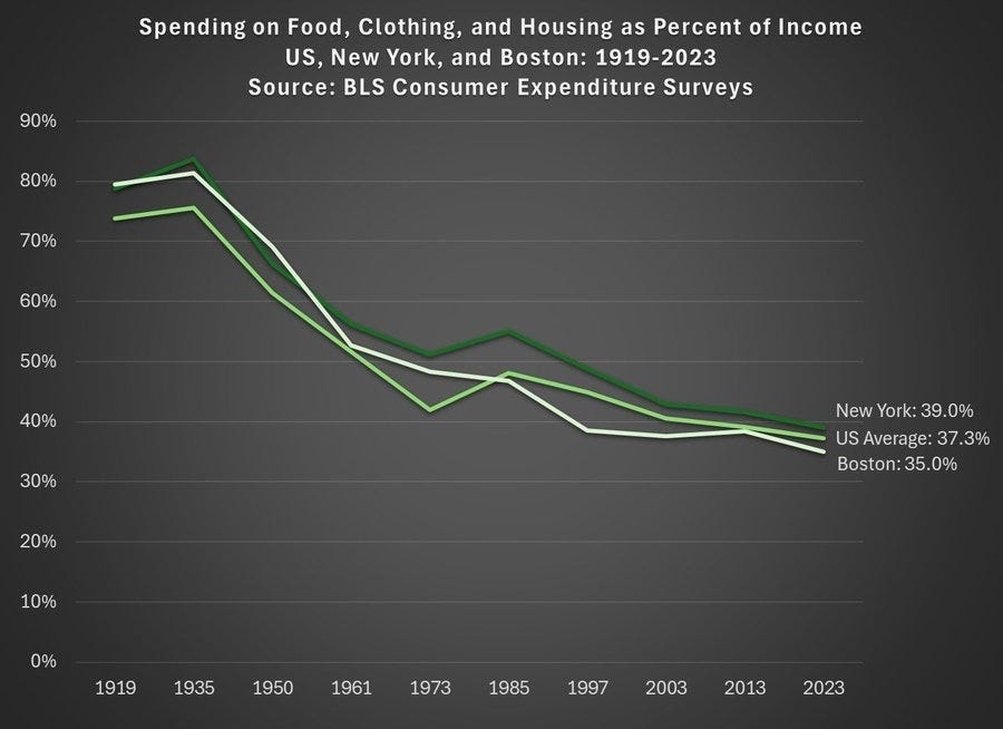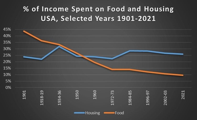 Jeremy Horpedahl: The share of income spent on food, clothing, and housing in the has declined dramatically since 1901 in the United States. It’s even lower than in 1973, which many claim is the beginning of economic stagnation.