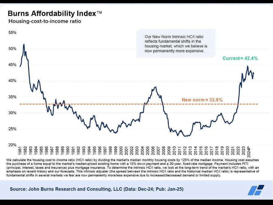 The graph does seem like it has to be understating the jump in recent years, with the jump in mortgage rates, and here’s the Burns Affordability Index, which divides the median monthly housing cost (all-in including insurance) for a 10% down, 30-year-fixed mortgage at current rates versus 125% of the median income (seriously, guys, 100%, use 100% and we can adjust for dual incomes):