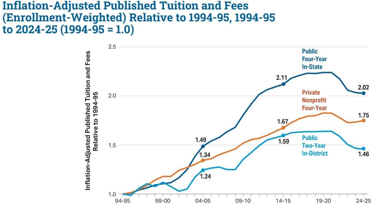 But sure, public primary and secondary school directly costs $0, so let’s focus on college. It does seem true on the base chart that costs leveled off, although at levels that are still a lot higher than in the 1990s, which was already higher than earlier, and also people feel more obligation to do more years of schooling to keep pace which isn’t factored into such charts.