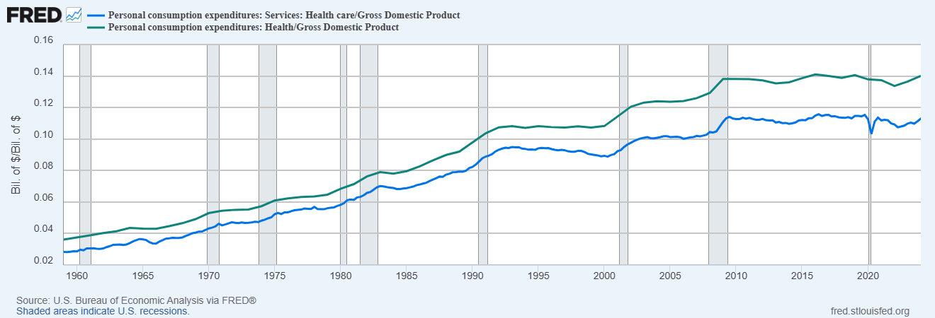 It could just be that Americans were willing to pay more for health care as they got richer, up to a point, but that at some point they said “OK, that’s enough.”