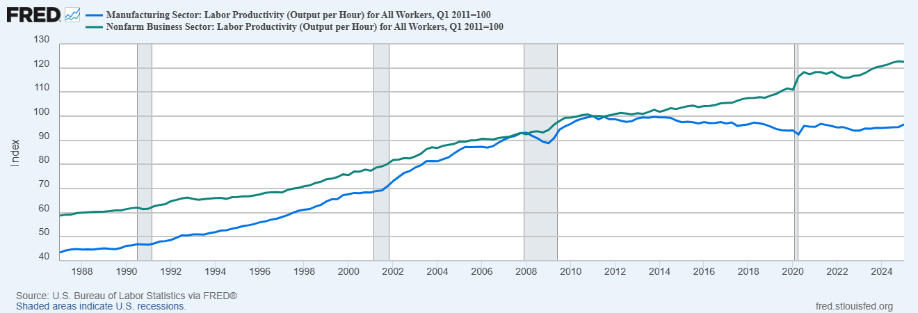 Noah Smith: And the story was compelling because it came with a simple theory to explain it. This was the notion that manufacturing productivity naturally increases faster than service productivity. Conceptually, it seems easier to figure out how to rearrange production processes in a factory, and apply new machine tools, than to figure out new ways to educate kids or take care of Grandma.