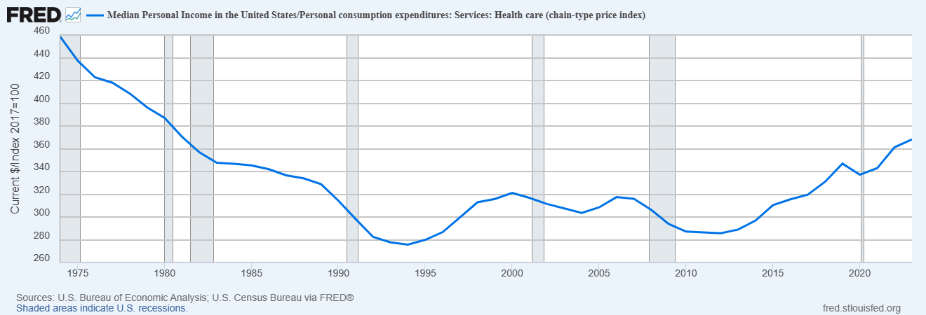 OK but anyway, what we really care about at the end of the day is affordability — i.e., how much health care an average America can buy. A good way of measuring affordability is to look at median income divided by an index of health care prices — in other words, how much health care the typical American can buy with their annual income.