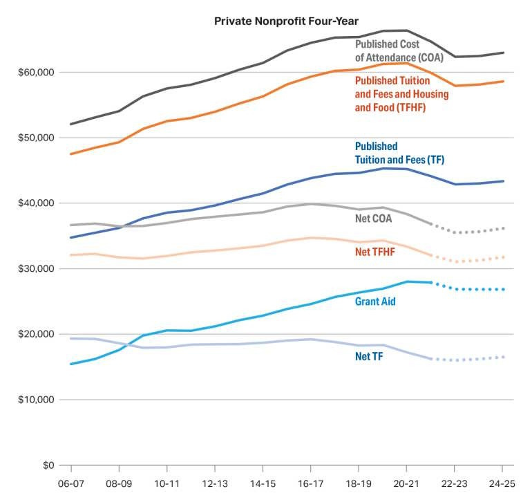Of course this doesn’t include financial aid (nor does Mark Perry’s chart, nor do official inflation numbers). Financial aid has been going up, especially at private schools. When you include that, it turns out that private four-year nonprofits are actually less expensive in inflation-adjusted terms than they were in the mid-2000s, even without accounting for rising incomes: