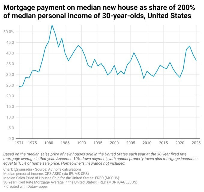The median household, with a median income and no outside help, does not by default buy the median house at today’s interest rate. Houses are largely bought with wealth, or owned or acquired in other ways, so by default if you’re relying purely on a median income you’re getting a lot less than the median house. Which is totally fine, the median house is historically huge, you can notch down a bit. Also, when rates go down we refinance and when they go up we delay moving, which lowers costs.