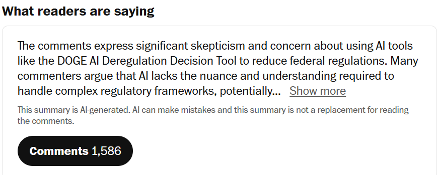 That’s where the AI tool comes in, the PowerPoint proposes. The tool will save 93 percent of the human labor involved by reviewing up to 500,000 comments submitted by the public in response to proposed rule changes. By the end of the deregulation exercise, humans will have spent just a few hours to cancel each of the 100,000 regulations, the PowerPoint claims.