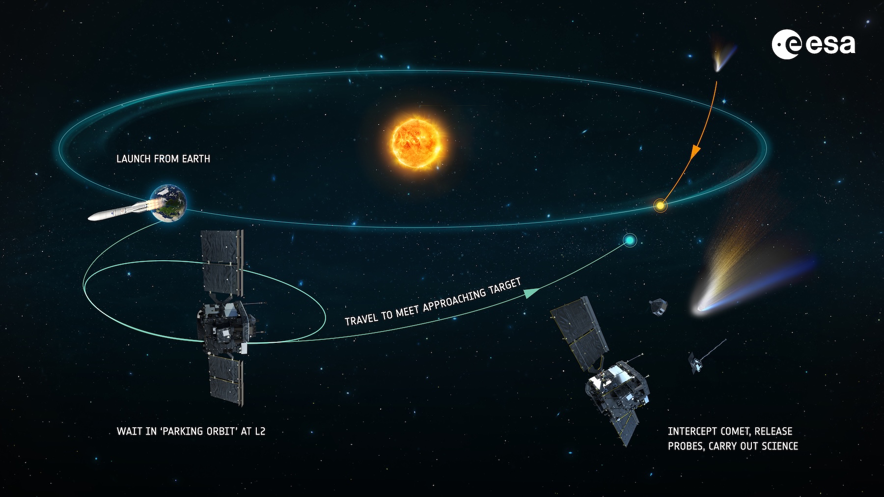 Long-period comets are typically discovered a year or two before coming near the Sun, still not enough time to develop a mission from scratch. With Comet Interceptor, ESA will launch a probe to loiter in space a million miles from Earth, wait for the right comet to come along, then fire its engines to pursue it.
